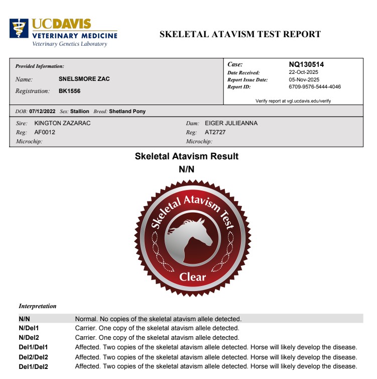 As part of our ongoing plans, we’re testing our ponies for Skeletal Atavism. This process will take some time, but every result plays an important role in building our understanding. We’re very happy to share that our three-year-old colt, Snelsmore Zac, has received his test results and is clear. He will now move on to his voluntary vetting over the winter